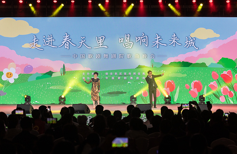 4月25日晚,“北京優秀演藝進雄安”系列活動之“走進春天里 唱響未來城”中國歌劇舞劇院歌曲晚會在雄安新區容城縣體育館舉行。1500余名來自疏解企業、疏解高校、參建單位的代表以及各行業先進典型、市民群眾齊聚一堂,共同領略國家級藝術院團帶來的視聽盛宴。 “走進春天里 唱響未來城”中國歌劇舞劇院歌曲晚會現場。