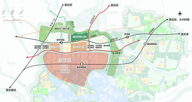 雄安郊野公園(以下簡稱“郊野公園”),位于雄安新區北部,東臨京雄高速,南近榮烏高速,與白洋淀高鐵站毗鄰,一小時到達北京、天津、石家莊、大興國際機場,是雄安新區起步區南北中軸線上重要景觀門戶。