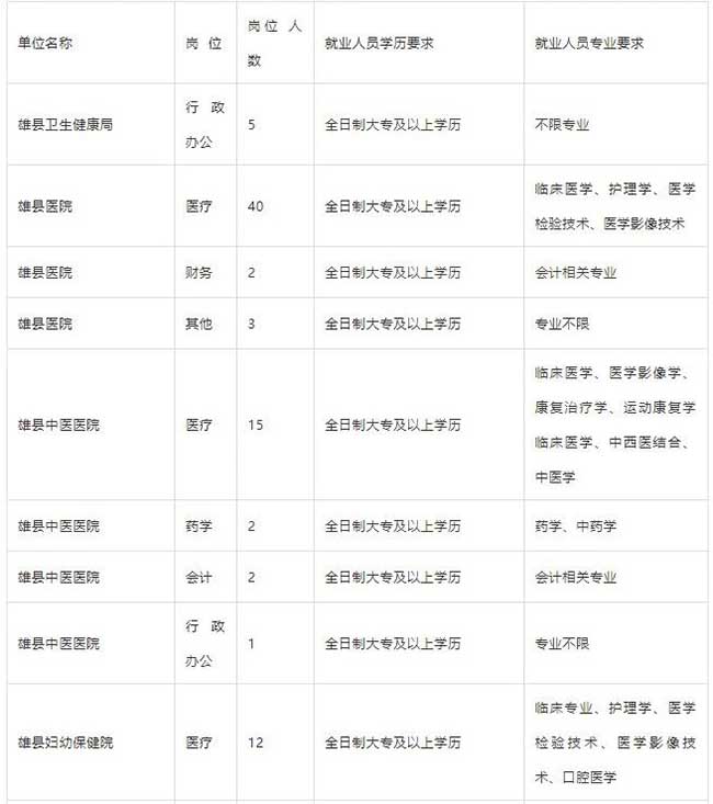 為解決雄縣醫(yī)療衛(wèi)生系統(tǒng)人員總量不足,人才嚴(yán)重短缺問(wèn)題,提升醫(yī)療衛(wèi)生服務(wù)能力,現(xiàn)根據(jù)工作需要,面向社會(huì)招聘數(shù)名公益性崗位工作人員。