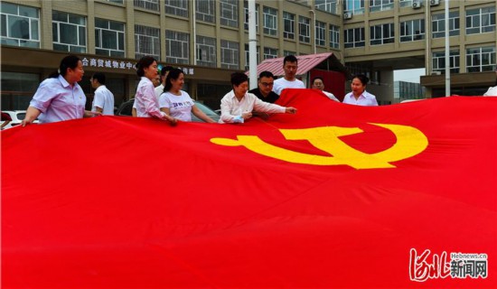 6月9日,雄安新區(qū)的建設(shè)者們同心接力繡黨旗。河北日?qǐng)?bào)記者耿輝攝