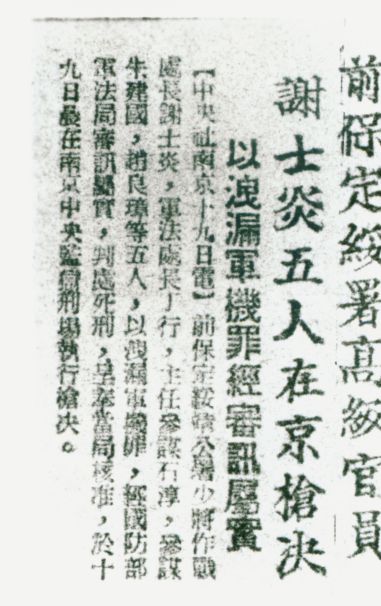 抗戰(zhàn)勝利后,任國民黨第十一戰(zhàn)區(qū)長官司令部少將作戰(zhàn)處長,因不堪忍受國民黨的黑暗統(tǒng)治,他主動聯(lián)系黨組織,不斷提供第十一戰(zhàn)區(qū)的戰(zhàn)略、戰(zhàn)役情報,獲得葉劍英的高度肯定,并被葉劍英親自批準(zhǔn)加入中國共產(chǎn)黨。從國民黨少將正式成為一名光榮的共產(chǎn)黨員后,謝士炎像一把插入國民黨心臟的利刃,為我黨我軍提供一份又一份極其重要的軍事情報,為華北、華東的解放作出了貢獻(xiàn)。