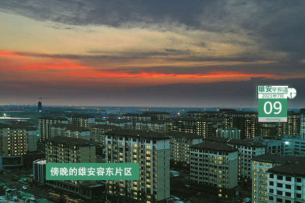 今天是2021年7月9日,星期五,天氣雷陣雨轉多云,23℃~35℃。在封面和大家見面的是傍晚的雄安容東片區。