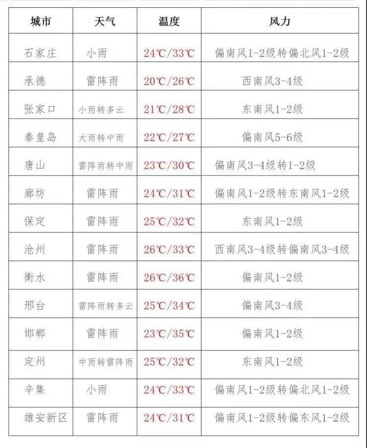 今天下午到夜間,全省多云轉陰,保定、廊坊及以南地區有大到暴雨,其中保定、雄安新區、石家莊、邢臺西部、邯鄲西部、滄州西部有大暴雨,個別地點有特大暴雨,其他地區陰有小到中雨。雷雨時局地伴有短時強降水、大風等強對流天氣。