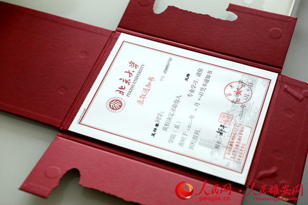 “雖然很早就得知了被錄取的消息,但是接到通知書的時候,心里依然很激動。”孟梓墨邊仔細(xì)將嶄新的錄取通知書展示給記者邊說,“我還特地上網(wǎng)查了下,‘錄取通知書’5個燙金大字是由北大中文系袁行霈教授題寫的,我覺得特別有韻味。現(xiàn)在特別盼望早點開學(xué),十分期待在燕園的生活。”