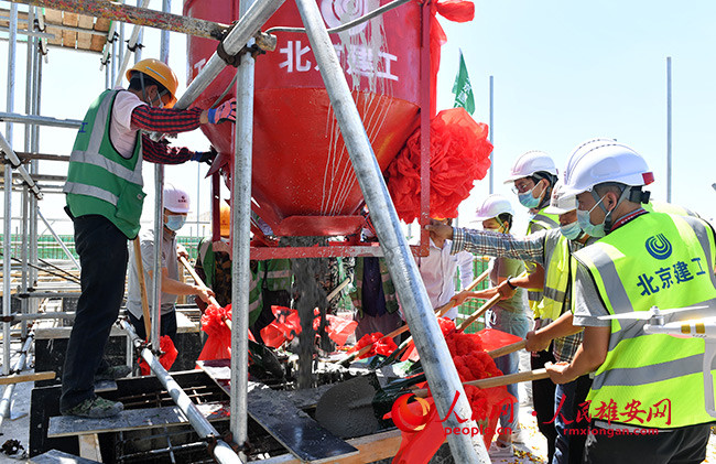 人民網(wǎng)雄安8月2日電 (宋燁文)8月2日11時(shí)30分許,伴隨著最后一方混凝土澆筑到位,雄安宣武醫(yī)院一期工程主體結(jié)構(gòu)封頂,正式進(jìn)入二次結(jié)構(gòu)施工階段。這是北京支持雄安新區(qū)建設(shè)的“三校一院”交鑰匙工程中體量最大的工程,也是雄安新區(qū)第一座大型三級(jí)甲等醫(yī)院。