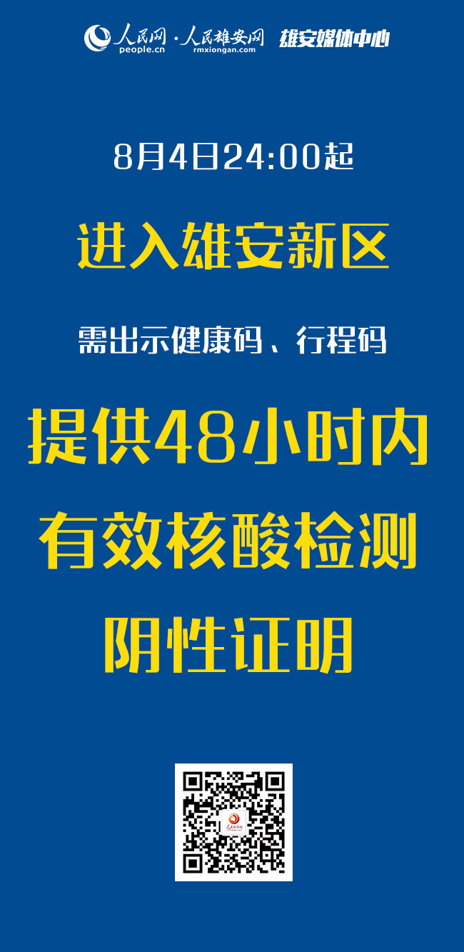 2.雄安新區(qū)應(yīng)對(duì)新冠肺炎疫情工作領(lǐng)導(dǎo)小組辦公室發(fā)布消息,決定自8月4日24:00起,凡進(jìn)入雄安新區(qū)的人員,需出示健康碼、行程碼,并提供48小時(shí)內(nèi)有效核酸檢測(cè)陰性證明。