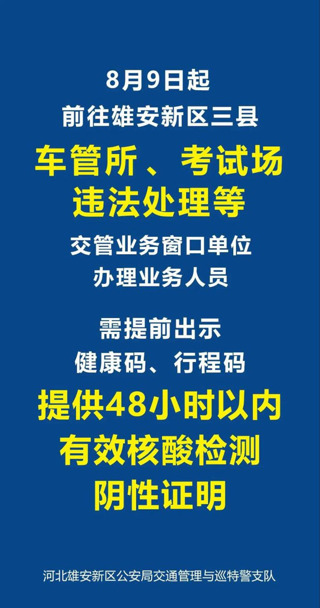 自8月9日起,到雄安雄縣、容城縣、安新縣車管所、考試場(chǎng)、違法處理等窗口單位辦理業(yè)務(wù)人員,需提前出示健康碼、行程碼、48小時(shí)以內(nèi)核酸檢測(cè)陰性證明,配合防疫人員測(cè)量體溫,進(jìn)入大廳辦理業(yè)務(wù)間隔一米距離。
