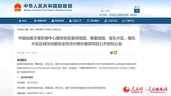 人民網雄安8月9日電 (何美萱)據財政部官方網站消息,中國地震災害防御中心雄安新區昝崗組團、寨里組團、容東片區、雄東片區區域性地震安全性評價野外勘探項目正在招標。