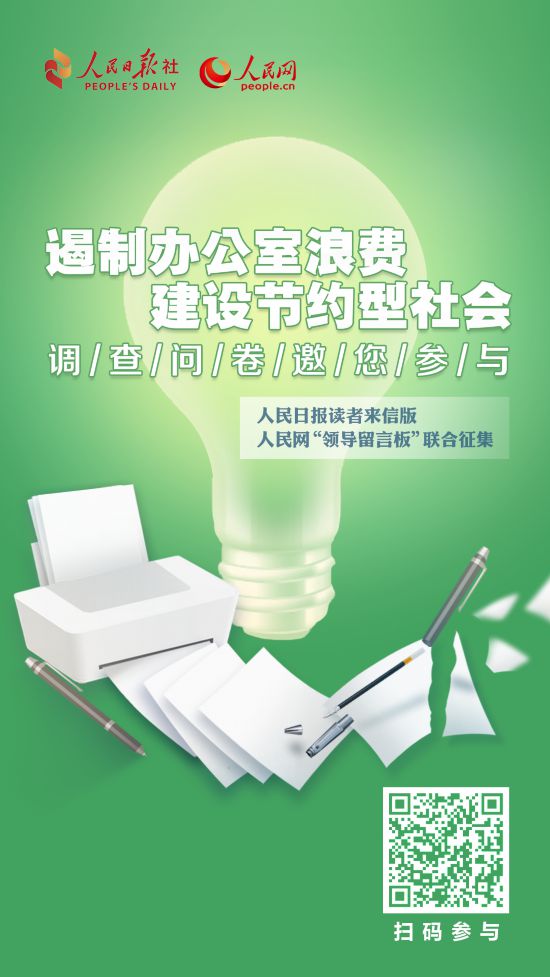 為遏制辦公室浪費,建設(shè)節(jié)約型社會,人民日報讀者來信版與人民網(wǎng)“領(lǐng)導(dǎo)留言板”即日起推出調(diào)查問卷。你對辦公室的浪費現(xiàn)象有什么看法?當(dāng)看到辦公室有同事浪費物品(資源),你會怎樣做?你認為辦公室產(chǎn)生浪費現(xiàn)象的原因有哪些?一起來參與吧!(劉書含)