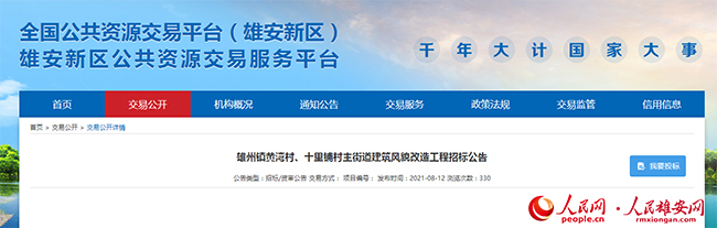 人民網(wǎng)雄安8月13日電 (何美萱)雄安新區(qū)雄縣雄州鎮(zhèn)黃灣村將建設(shè)美食城和18處旅游民宿。這是雄安新區(qū)公共資源交易服務(wù)平臺(tái)發(fā)布的《雄州鎮(zhèn)黃灣村、十里鋪村主街道建筑風(fēng)貌改造工程招標(biāo)公告》顯示的。