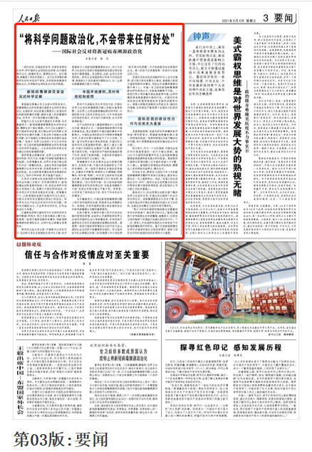 巴基斯坦伊斯蘭堡和平與外交研究所所長穆罕默德·阿西夫·努爾日前在媒體上撰文說,美國等一些西方國家忽略科學事實,將新冠病毒溯源和疫情政治化,這種行徑比病毒本身更致命。