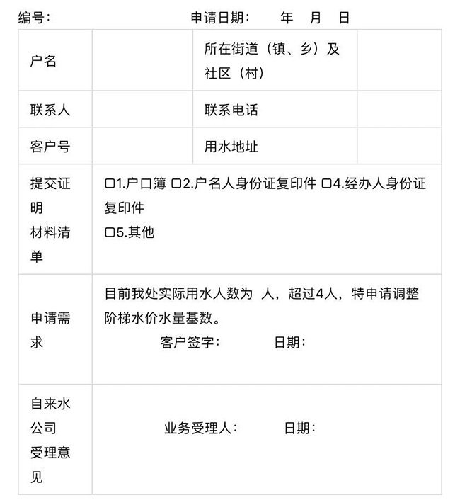 5、申請人申請增加的用水定額從申請審批通過后的下一次抄見表開始有效。申請通過前,當(dāng)年已查抄水量按原有用水定額執(zhí)行階梯水價;申請通過后至當(dāng)年最后一次抄見表止,按增加后的用水定額執(zhí)行階梯水價。