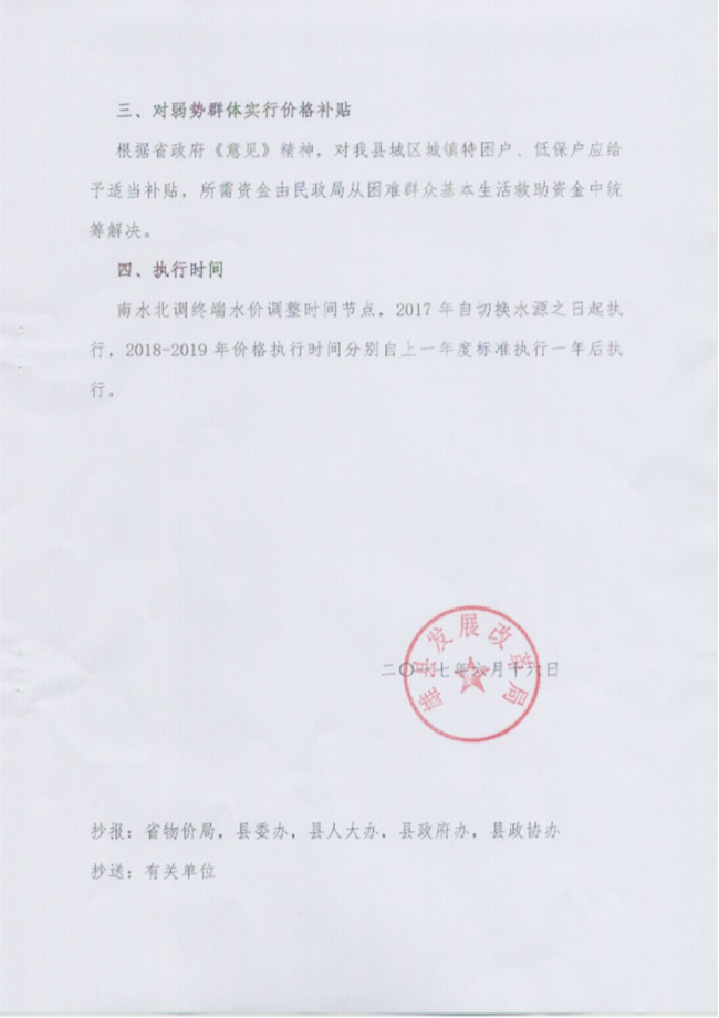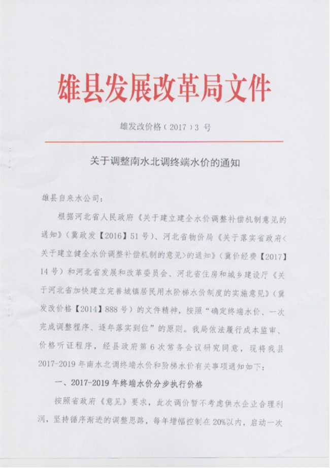 雄縣發(fā)展改革局《關(guān)于調(diào)整南水北調(diào)終端水價的通知》(雄發(fā)改價格〔2017〕3號)。