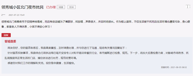 8月14日,雄安新區(qū)容城縣對(duì)留言進(jìn)行回復(fù),表示網(wǎng)友反映的情況已經(jīng)由綜合行政執(zhí)法局派專人調(diào)查處理,并與該留言群眾取得了聯(lián)系。針對(duì)擾民現(xiàn)象,綜合行政執(zhí)法局已每天安排專人對(duì)沿街餐飲行業(yè)、夜市攤販進(jìn)行檢查、規(guī)范。