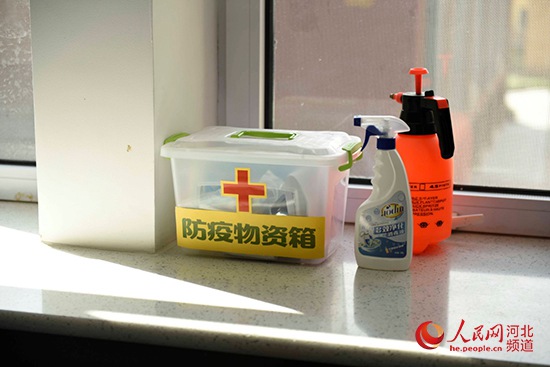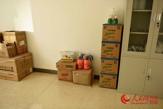 石家莊市智匯小學儲備的消殺藥品及口罩。 人民網 祝龍超攝