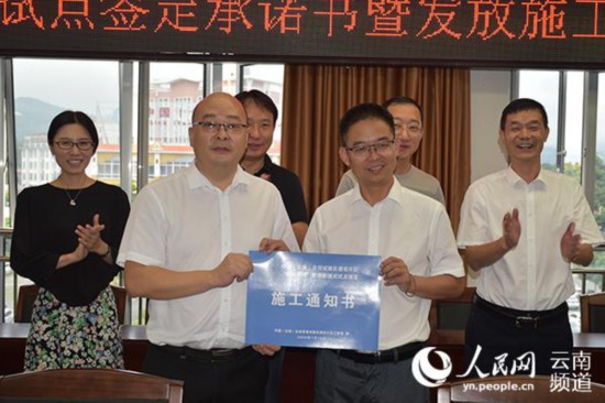 云南自貿(mào)試驗(yàn)區(qū)德宏片區(qū)管委會(huì)向企業(yè)發(fā)放“先建后驗(yàn)”項(xiàng)目施工通知書。張帥攝