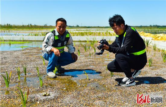 安新縣愛鳥護鳥形象大使韓戰橋(右)用相機拍下孝義河河口濕地的鳥蛋。
