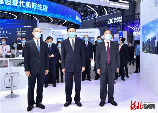 會見前,肖亞慶、王東峰、許勤等共同參觀了2021中國國際數(shù)字經(jīng)濟(jì)博覽會展覽,深入了解數(shù)字經(jīng)濟(jì)領(lǐng)域最新成果。 河北日報(bào)記者 趙威 攝