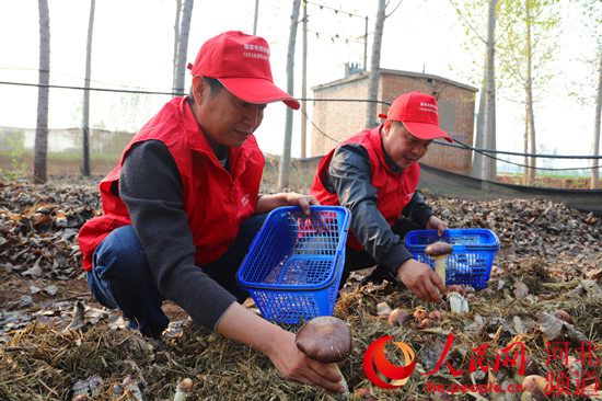 邯鄲市廣平縣供電公司工作人員幫助工人采摘赤松茸。 邯鄲市委宣傳部供圖