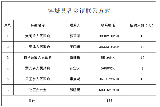根據公告,容城縣大河鎮人民政府招40人,容城縣小里鎮人民政府招12人,容城縣晾馬臺鎮人民政府招12人,容城縣賈光鄉人民政府招4人,容城縣平王鄉人民政府招40人,容城縣社區辦公室招30人,崗位服務期限最長為三年。