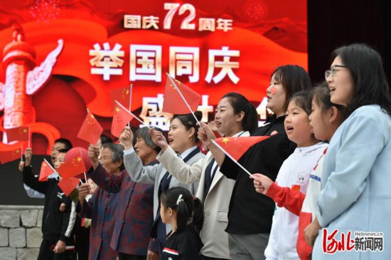 10月1日,阜平縣駱駝灣村駱駝灣大戲臺前,村民和游客一同唱響《我和我的祖國》,一面面五星紅旗飄揚在駱駝灣村。河北日報記者趙海江攝