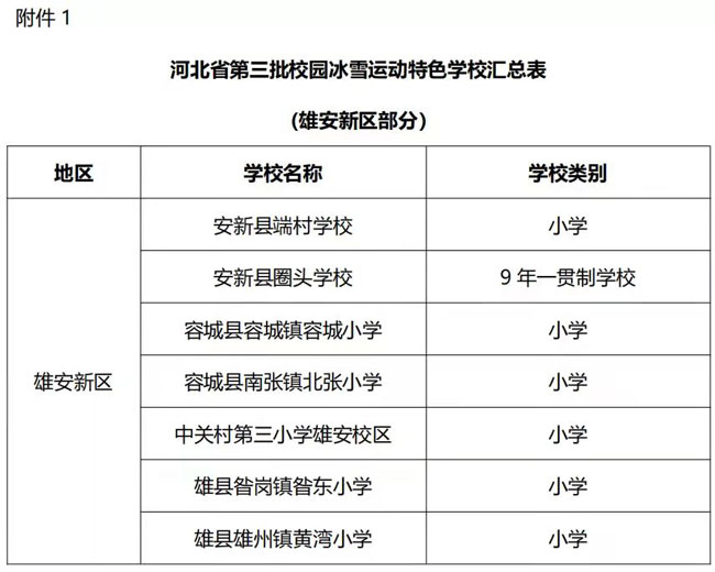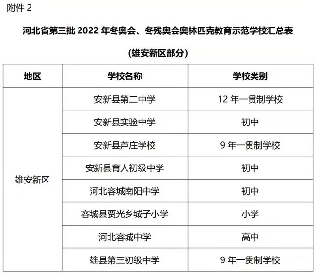 5、雄安安新縣端村學校等7所學校入選河北省第三批校園冰雪運動特色學校;安新縣第二中學等8所學校入選河北省第三批北京 2022年冬奧會、冬殘奧會奧林匹克教育示范學校。名單如下: