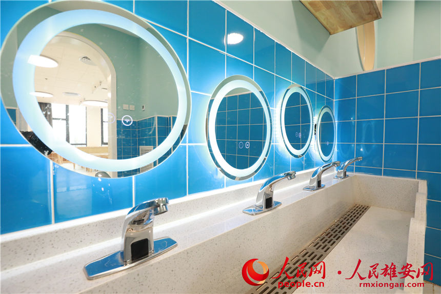 雄安容東片區(qū)容和佳泰幼兒園內(nèi)洗手間,墻上的鏡子設(shè)置有止水開(kāi)關(guān)和照明開(kāi)關(guān)。人民網(wǎng) 李兆民攝