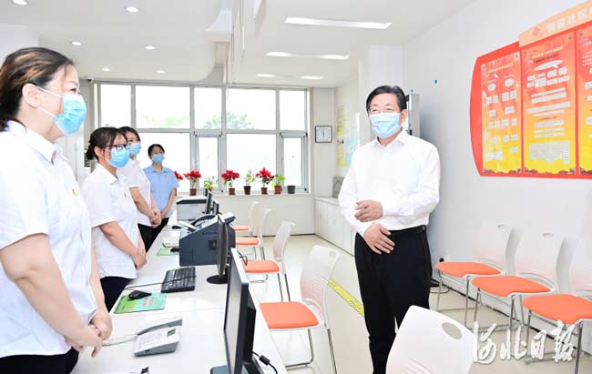 6月7日上午,省委書記、省人大常委會主任王東峰在石家莊市調研檢查。這是王東峰在裕華區建華南街道潤園社區,認真聽取“紅管家”服務品牌情況匯報,實地察看“紅色物業”和一站式服務大廳等工作情況。河北日報記者趙威攝
