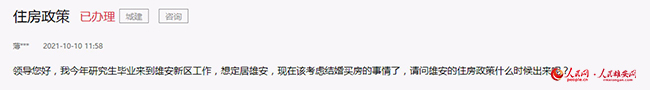 人民網雄安11月10日電 (何美萱、劉師豪)“我今年研究生畢業來到雄安新區工作,想定居雄安,現在該考慮結婚買房的事情了,請問雄安的住房政策什么時候出來呢?”日前,有網友在人民網“領導留言板”上留言,咨詢雄安新區有關住房政策。