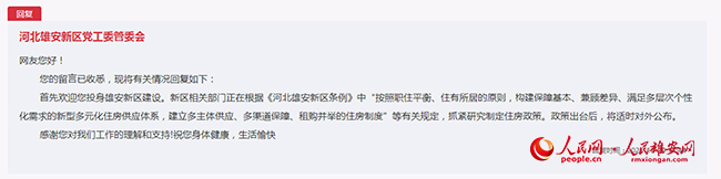 收到留言后,雄安新區黨工委管委會回復稱:“相關部門正在根據《河北雄安新區條例》中‘按照職住平衡、住有所居的原則,構建保障基本、兼顧差異、滿足多層次個性化需求的新型多元化住房供應體系,建立多主體供應、多渠道保障、租購并舉的住房制度’等有關規定,抓緊研究制定住房政策。待政策出臺后,將適時對外公布。”