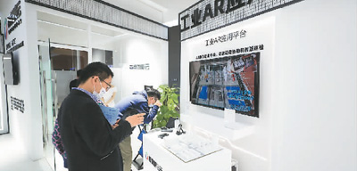在2021全球工業互聯網大會上,人們在體驗百度智能云工業AR應用平臺。新華社記者 楊 青攝