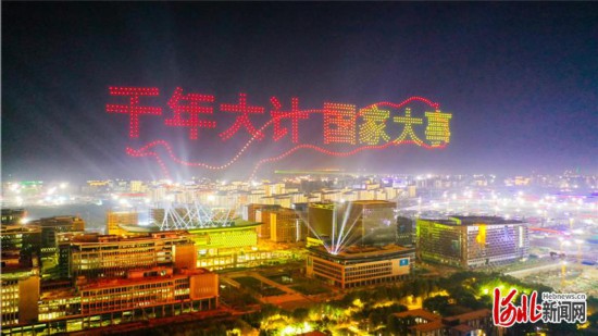 2021年7月1日,由1000架無人機組成的“千年大計 國家大事”字樣閃耀在容東片區上空。 河北日報記者耿輝攝