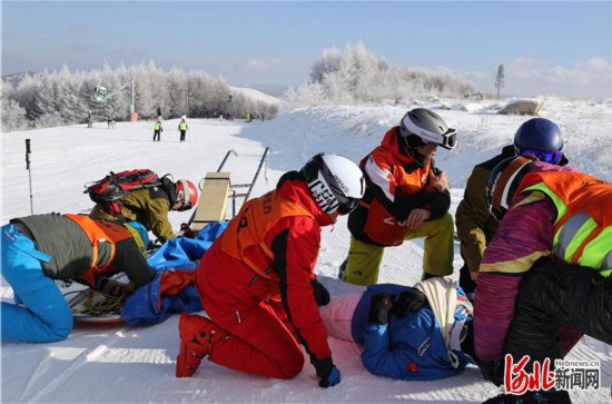 在張家口市崇禮區萬龍滑雪場,冬奧滑雪醫療保障“夢之隊”云頂隊河北隊員在進行雪道醫療救護演練。(河北日報資料片)河北日報記者賈恒攝