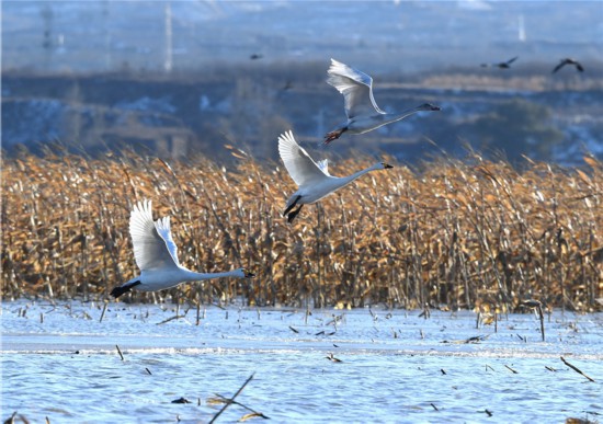 11月13日,三只天鵝在懷來縣官廳水庫國家濕地公園飛舞。