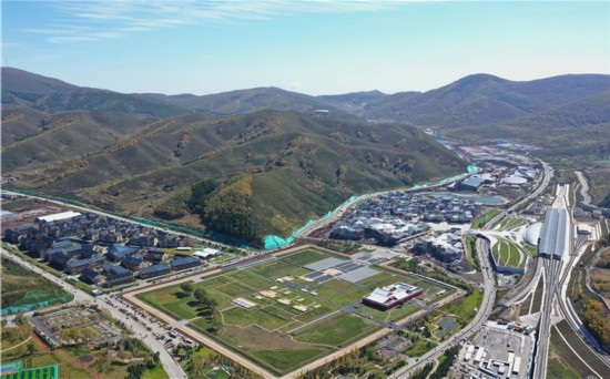 9月27日拍攝的張家口奧運村(左)、崇禮太子城冰雪小鎮(中)和高鐵太子城站(無人機照片)。新華社記者 楊世堯 攝