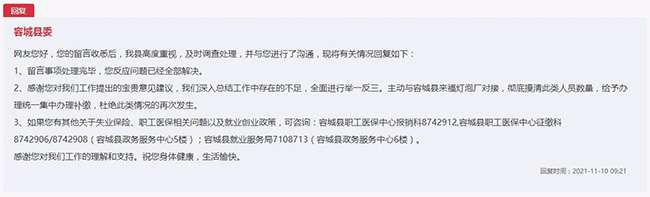 容城縣人社局下屬容城縣醫療保險基金管理中心(以下簡稱“醫保中心”)相關負責人在接到留言后,立即聯系了當事人及其之前所在公司,在了解清楚事情起因后,醫保中心工作人員一方面責成企業摸清醫療保險斷繳員工人數,通知員工到醫保中心補繳,另一方面與容城縣失業保險所溝通,在保證失業金領取期間無其他欠費的情況下,將斷繳員工先轉為靈活就業人員,待醫保補繳結束后再重新調回失業保險序列,解決了當事人及其同事們醫保欠繳問題。