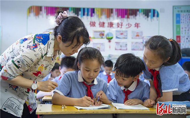 5月26日15時50分,石家莊市草場街小學四年級4班的教室里,張艷老師在給留校接受課后服務的學生們輔導作業。 河北日報記者趙海江攝