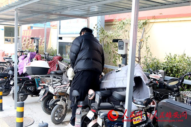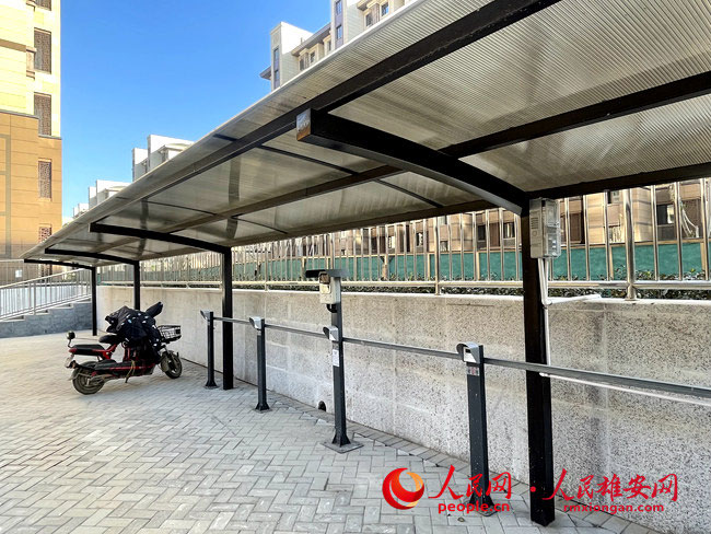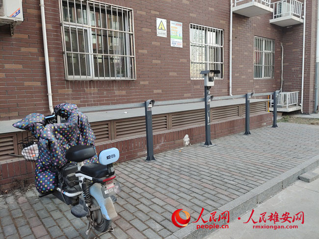 雄安新區(qū)容城縣領(lǐng)秀城小區(qū)樓前車棚里的充電樁,配有視頻監(jiān)控系統(tǒng)。人民網(wǎng) 劉師豪攝
