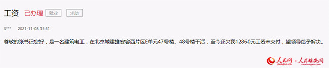 人民網雄安12月2日電 (王紅)“領導您好,我是一名建筑電工,在北京城建雄安容西片區E單元47號樓、48號樓干活,(工期結束后)至今還欠我12860元工資未支付,望領導給予解決。”