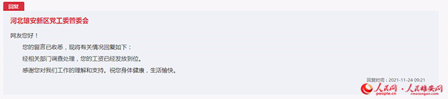 雄安新區黨工委管委會在收到留言后,責成相關部門進行調查處理,并回復網友稱“工資已經發放到位。”記者聯系留言的網友了解到,他和30多名工友被拖欠的80余萬元工資已經拿到手了。