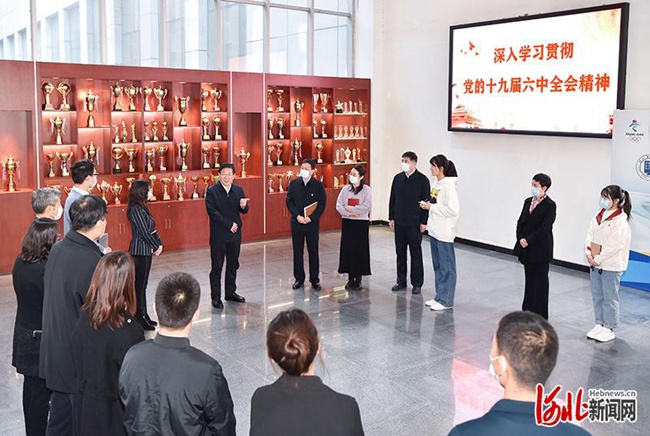 王東峰指出,要聚焦“怎么想”,切實解決好學習宣傳貫徹的思想自覺和行動自覺問題,真正把“要我學”變成自覺自愿的“我要學”,始終把學習宣傳貫徹黨的十九屆六中全會精神作為重大政治任務,學深悟透做實。黨的十九屆六中全會,是在“兩個一百年”歷史交匯點召開的一次具有里程碑意義的重要會議。全會聽取和討論了習近平總書記受中央政治局委托作的工作報告,審議通過了《中共中央關于黨的百年奮斗重大成就和歷史經驗的決議》,具有重大的政治意義、歷史意義和時代意義。廣大師生要深入學習宣傳貫徹黨的十九屆六中全會精神,與學習貫徹習近平新時代中國特色社會主義思想結合起來,與學習貫徹習近平總書記“七一”重要講話精神結合起來,與學習貫徹習近平總書記對河北工作一系列重要指示批示和黨中央決策部署結合起來,與深化黨史學習教育和“四史”宣傳教育結合起來,與辦好人民滿意的教育結合起來,從黨百年奮斗的偉大成就中鼓舞斗志,從黨百年奮斗的歷史意義中堅定信念,從黨百年奮斗的歷史經驗中汲取智慧,切實做到學深悟透做實,內化于心、外化于行、知行合一,努力成長為堪當民族復興大任的時代新人。