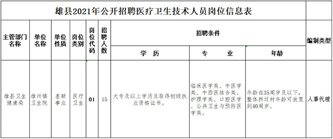 醫療衛生專業技術人員15名,詳見《雄縣2021年公開招聘醫療衛生技術人員崗位信息表》。