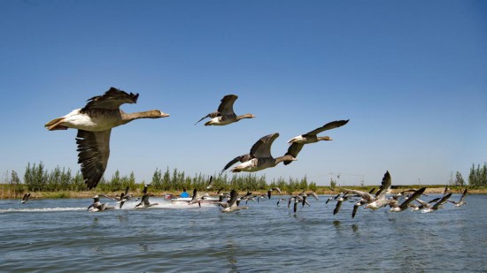 一群灰雁在衡水湖國家濕地公園水面上嬉戲飛翔(2018年9月28日攝)。新華社記者 朱旭東 攝