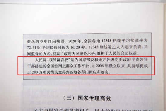 這則來自人民網“領導留言板”2020年承接“十四五”規劃編制工作網上意見征求活動期間的故事,連同人民日報建設的人民網“領導留言板”本身,一起被納入了國務院新聞辦公室12月4日發布的《中國的民主》白皮書第四章,用于闡釋“廣泛真實管用的民主”,“人民利益要求既能暢通表達,也能有效實現”。長期研究“領導留言板”的學者和各界中外人士,均注意到了白皮書有關內容的表述,肯定人民日報社領導人民網秉承“人民至上”理念長期探索網上群眾路線、建設網上群眾工作平臺,成為全過程人民民主的創新舉措。