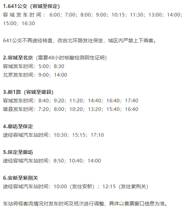 9、12月20日起,容城汽車站部分線路恢復運營,具體發車時間如下↓↓↓