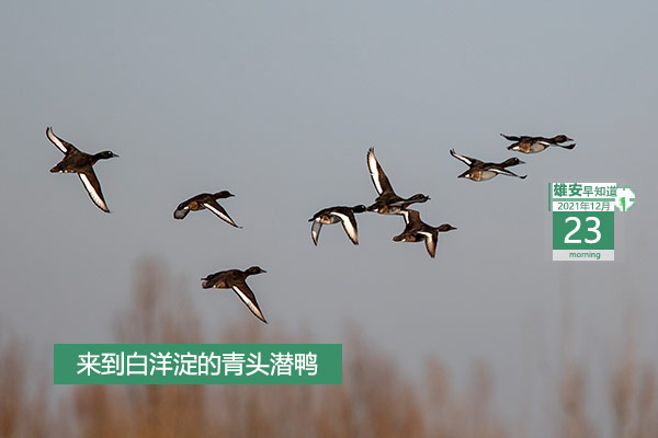今天是2021年12月23日,星期四,天氣陰轉小雪,-6℃~13℃。在封面和大家見面的是來到白洋淀的青頭潛鴨。