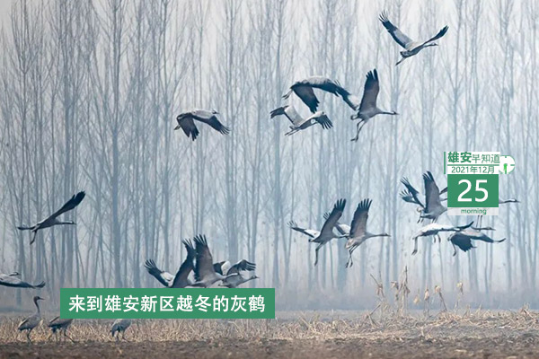 今天是2021年12月25日,星期六。天氣晴,-4℃~-13℃。在封面和大家見面的是來雄安新區越冬的灰鶴。