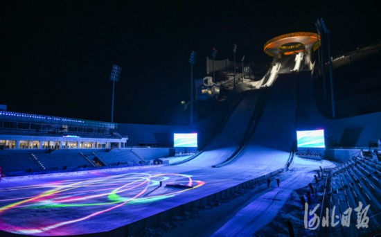 2021年12月4日,國家跳臺滑雪中心在燈光映射下流光溢彩熠熠生輝,“雪如意”魅力十足。河北日報記者耿輝攝
