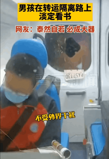 11月5日,石家莊市深澤縣,一名男孩在轉運隔離路上掏出書本,淡定地看起來。