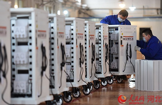 河北海捷現(xiàn)代教學(xué)設(shè)備公司車間工作人員正在組裝智能充電車。 苑立偉攝